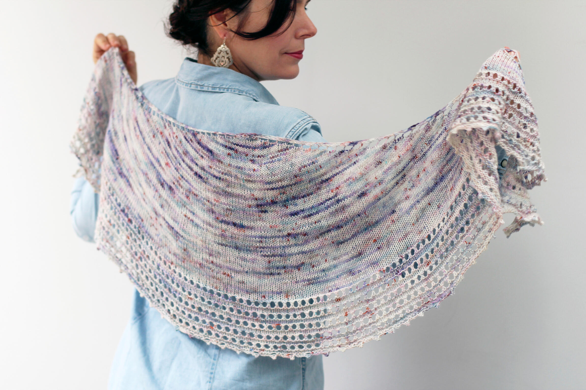 The Spindrift Shawl is delicate, cosy and deceptively simple to knit. It's a contemporary take on traditional shawl knitting, with its manageable size, super-wearable crescent shape and frothy eyelet border.